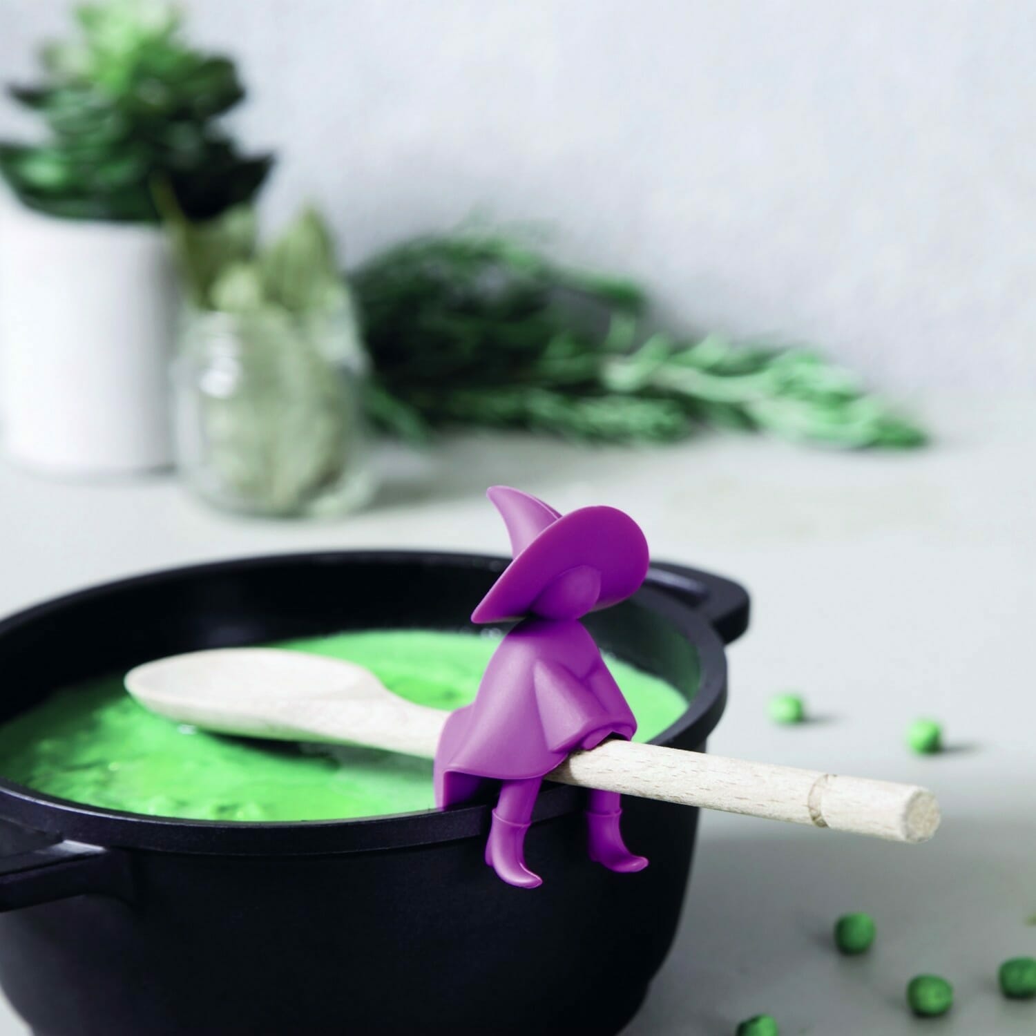 Agatha keukenhulpje van Ototo. Lepelhouder en steam releaser in de vorm van een heks. De Agatha spoon holder & steam releaser is gemaakt van siliconen en heeft een paarse kleur. Heksje wordt over een pollepel geschoven en kan op de rand van een pan zitten. De rug van de heks tilt het deksel een stukje op en zorgt dat de stoom kan ontsnappen. De lepel kan uitdruppelen boven de pan. Geschikt voor de vaatwasser. Hittebestendig.