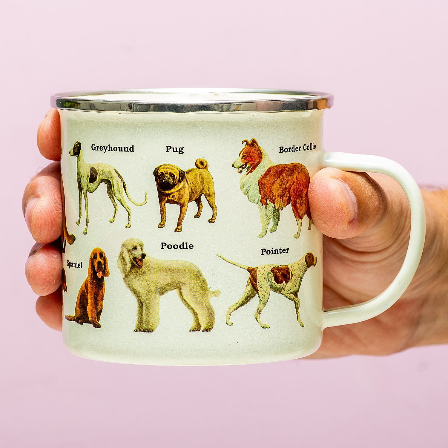 Camping mok van Gift Republic. Beker met de afbeelding van allerlei hondenrassen, met de namen erbij geschreven. De mok is gemaakt van emaille. Dit materiaal is zo goed als onbreekbaar en lichtgewicht. Het is de perfecte campingmok die je drinken ook nog eens lang warm houdt. Niet geschikt voor in de vaatwasser en magnetron. Afmeting: 13 x 10 x 9 centimeter.