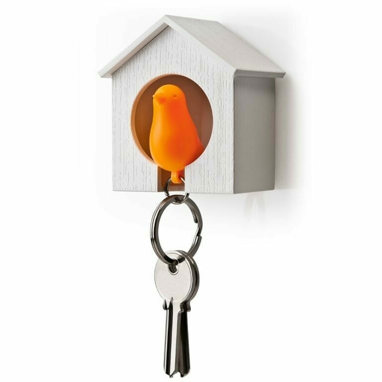 Sparrow sleutelhanger van Qualy. Wit huisje met een oranje vogeltje. Vogeltje waar je sleutels aan kunt hangen. Nooit meer je sleutels kwijt. Bij thuiskomst doe je het vogeltje terug in het huisje. Eenvoudig te monteren aan de muur met schroeven of dubbelzijdig tape. Vogeltje is ook een fluitje. Afmeting: 5,5 x 7 x 4,5 centimeter.