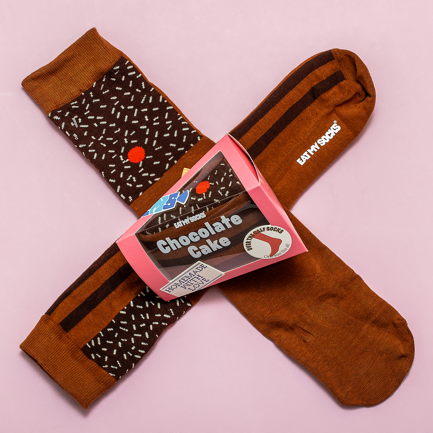 Taart sokken van DOIY. Sokken die er in de verpakking uitzien als een stuk chocoladetaart. Deze originele sokken zijn zo verpakt, dat het net is alsof je een overheerlijk stuk taart in je handen hebt. In werkelijkheid is het een paar sokken in de kleur van chocoladetaart, in het licht- en donkerbruin, met sprinkles en kers. De Cake socks van DOIY zijn gemaakt van katoen, elastaan, polyester en polyamide. One size fits all, geschikt voor maat 36 tot en met 46.